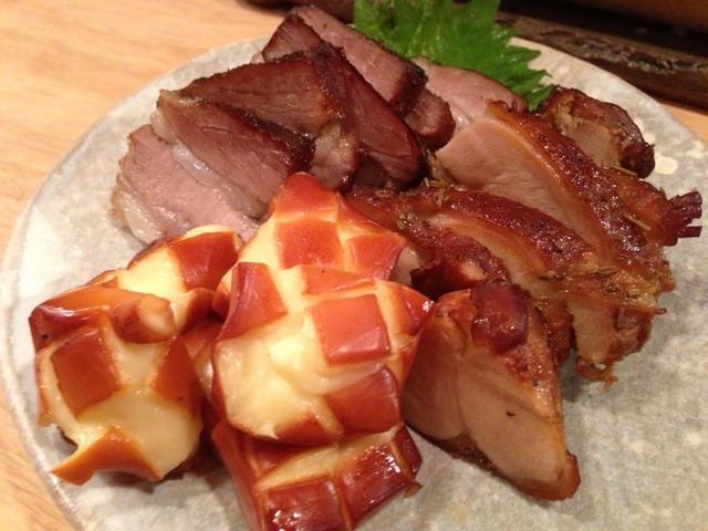 大将が自分で作陶したという薫製器で作ったというスモークの盛り合せ。