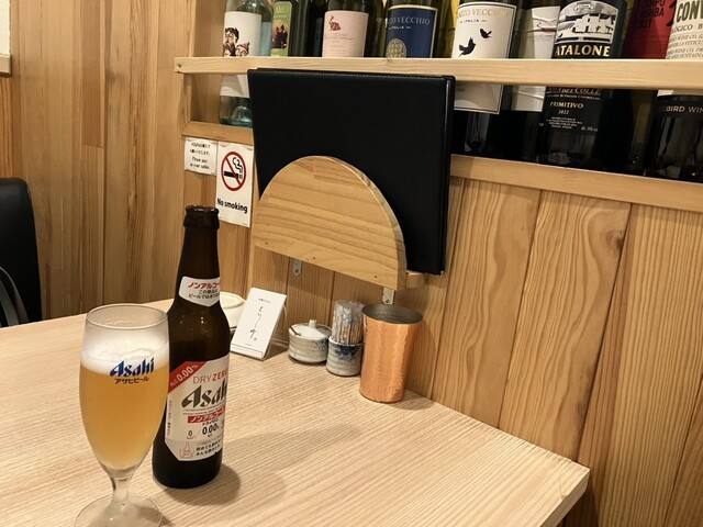 知人情報ではビールが美味いと言うので、連れはビール。ワタシはノンアルビールでスタート。