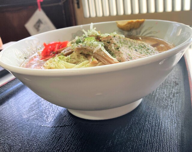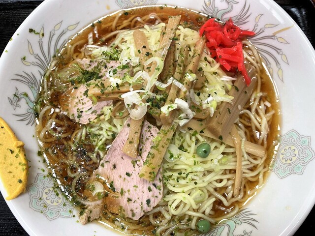 ネギ、メンマ、チャーシュー2枚、グリーンピース、青海苔、紅生姜