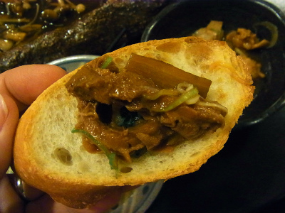 煮込みをガーリックトーストに載せるって、新しい頂き方ですね。