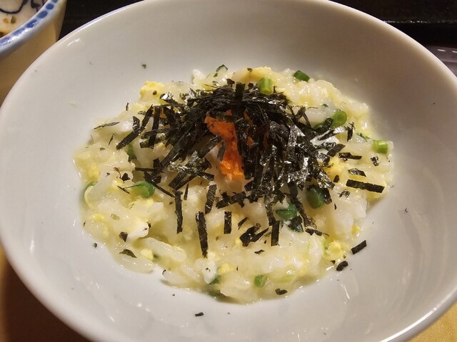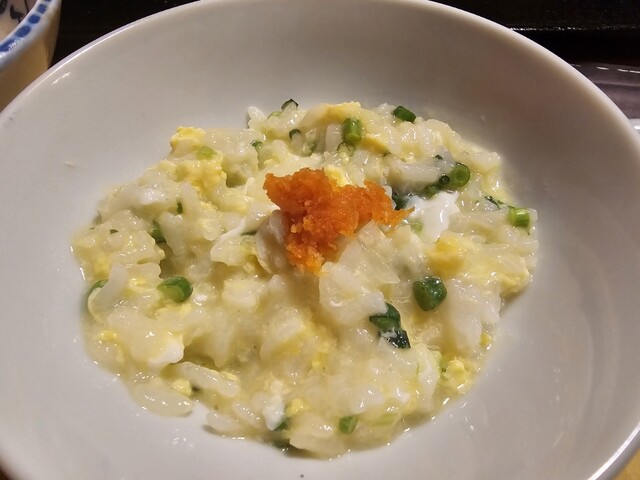 雑炊は、旨味が凝縮された旨味を一気に吸い込んでいて、ポン酢を少し垂らすと、旨味が倍増します。