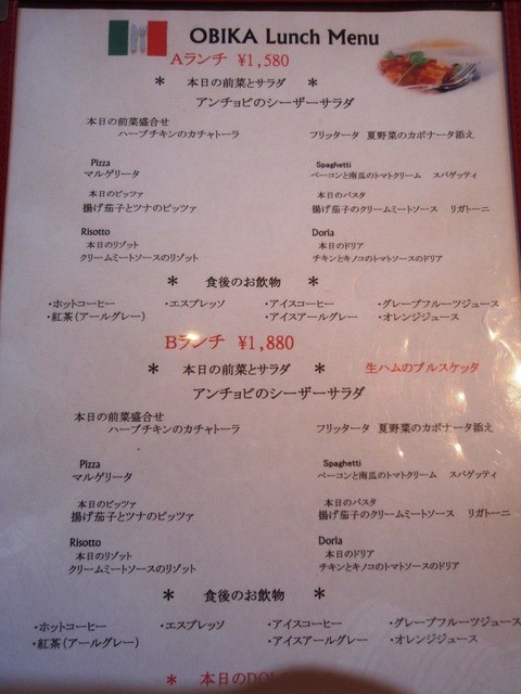 熱い接客、情熱サービスの裏横浜イタリアンのお店とは?裏横浜にある開店間もないお店。新進気鋭でホールのおぇさんの熱いサービスに感銘を受け、おすすめをいただいた。 名が高いクワトロフォルマッジ手作りのチラシを頼りにそのお店へ足を運ぶ。 そしていざお店へ・・・店舗はビルの2階にある。一階部分は駐車場となっていて、国道1号線高島トンネルの脇にその店がある。幸い国道が地下化されているので騒音は気にならない。早速中へ入ってみることに開放的なエントランス天井が高く、シンプルな内装で、イタリアの町の食堂を髣髴させる。熱いサービスを担当するスタッフとはキッチンとホールの連携プレイでもてなしに定評がある。元気でハキハキした受け答えが広い空間に響き渡る。お店の名前になっている「OBIKA」(オービカ)、南イタリアの方言で「ようこそ! さぁ、どうぞ!」という意味で使われている。ランチメニューは1,580円からはやや高価な半面、選択の幅も広い。一人でちょっとリッチなランチの利用も十分ありえる設定。では気になる料理は 本日の前菜盛り合わせランチの前菜とサラダが一皿に盛り付けてある。 アンチョビのシーザーサラダ ハーブチキンのカチャトーラ フリッタータ 夏野菜のカボナータ添え以上3点が一つのさらに。色鮮やかで食べる人をあきさせない。オリーブオイルの香りが充満する美味しさ。 本日のドリアキチンとキノコのトマトソースのドリアはチーズがとろ〜っとして香り豊かで美味しい。熱々のピザは四種類が合わさった。一度に4回美味しい、ちょ〜おすすめモノ!!もちろん今回お店の人の熱烈なおすすめでもある。四種類はモッツァレラ、パルミジャーノ、ゴルゴンゾーラ、マスカルポーネで南イタリア原産のレモンが入っている蜂蜜をかけて食べるそうだ。蜂蜜のピッチャー、写真で見ると大きいと想うが直径は100円だまぐらい。このとろ〜っとした蜂蜜ととろっとしたチーズが非常にピッツァとあう。どんよりとした贅沢感に満たされてしまう。 最後は定番のコーヒーなぜかミルクの入れ物がついて来る。可愛いけど・・・満足度は最高、コストパフォーマンスを求める一人ランチは向いていないが、総合的な満足度の向上には最適。壁一面窓になっているのでどこか食堂の雰囲気もないわけでない。ちなみにトイレは恐ろしいほどの広さで落ち着かない。自家製果実酒も550円から販売している。お洒落なコーナーを醸し出している。-まとめ全体的には開放感があって食事やデート、長年久しく会っていない友達との会話に最適なサービスとひと時を提供してくれる。メニューも豊富で選択に困るが迷わず店員に相談しよう。きっと熱いサービスでもっともよい提案をいただけるはず。お会計はヨーロッパと同じ、テーブル会計。玄関にレジを置かないのが「食堂」のイメージに貢献しているのかもしれない。