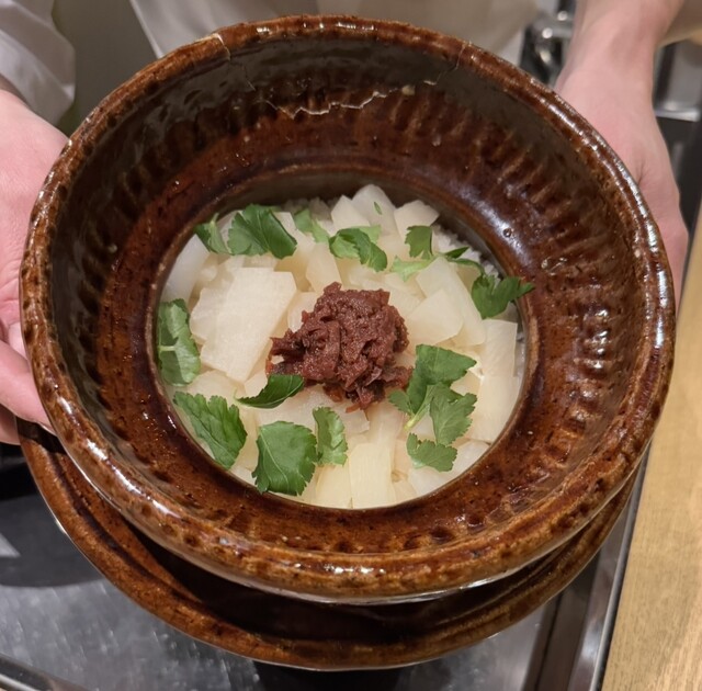 元エンジニアという異色の経歴を持つ田川さん。業界に入った年齢も普通の料理人よりはだいぶ遅く、歳下の先輩たちの下、有名店で修行されています。料理にかける熱意やこだわりは素晴らしいものを当初から感じましたが、年々凄みを増し、今では誰もが認める名店となりました。いつも楽しく調理される様子をカウンター越しに見るだけでも、こちらも幸せな気分になります。