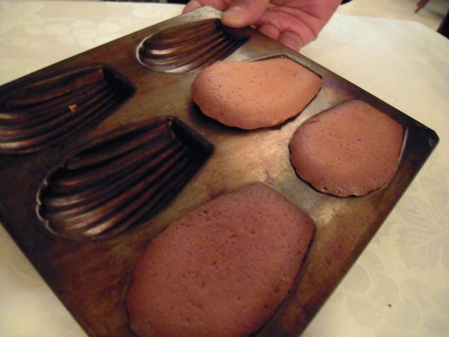「焼き立てをおひとつどうぞ、口の中でとろけますよ。」と、型に入ったままの熱々のマドレーヌ。