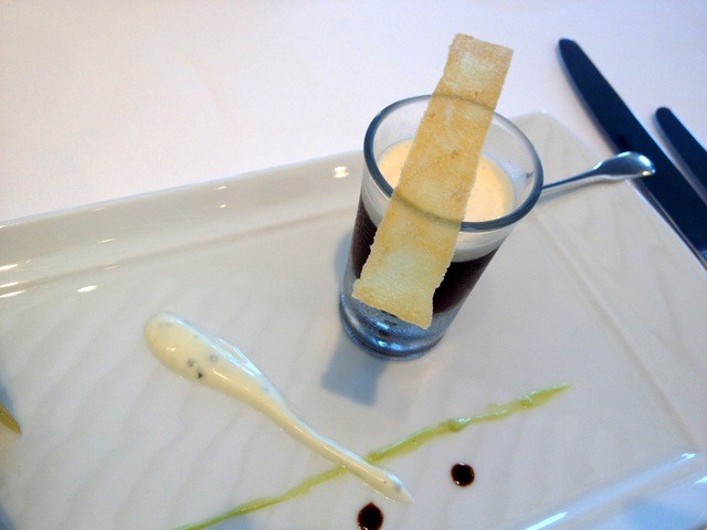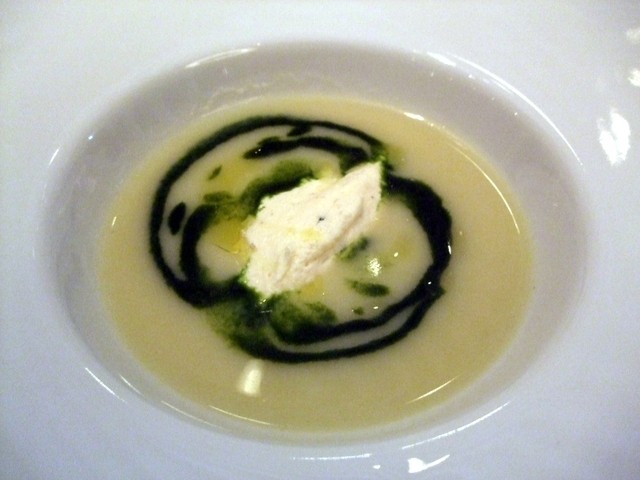 ヴィシソワーズにトリュフの香り スモークサーモンとハーブのクネル