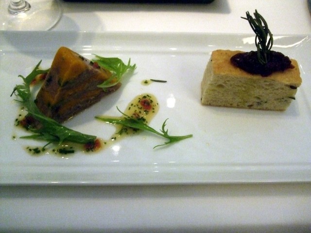 鴨肉とエスペレット風味の南瓜のマルブレ オニオンルージュのマーマレードにローズマリー風味のフォカッチャ