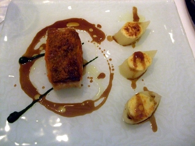 雌鹿と鴨のフォアグラのロースト セロリのスービーズ ジビエのソース