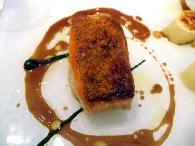 鱈のペキーオのパン粉焼き ポワロー葱のフォンダン ナツメグお香るジュ