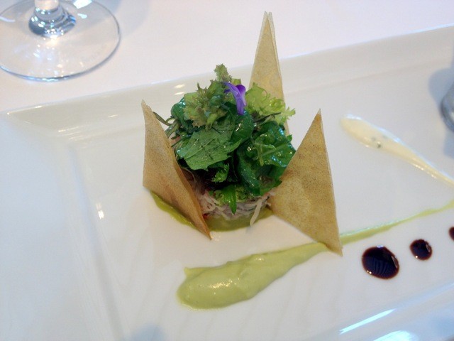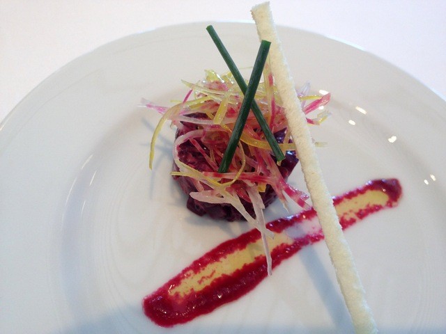 ・鮪とスモークサーモン 生姜風味の紫ポテトとセルフィーユ 香りのあるヴィネグレット