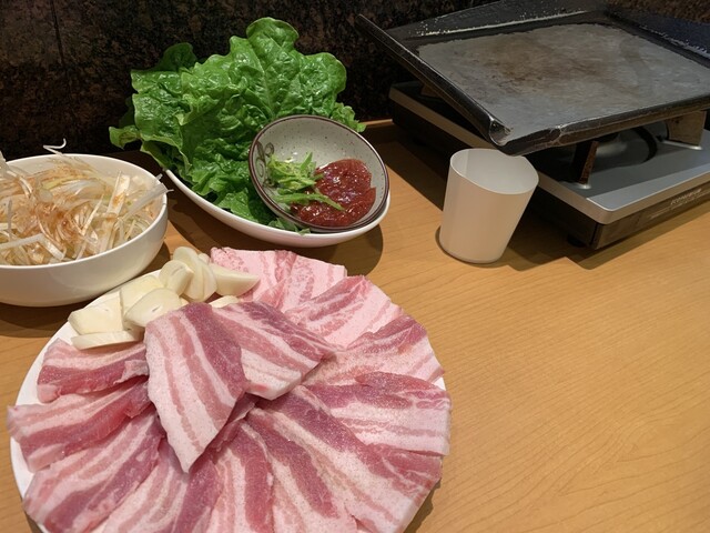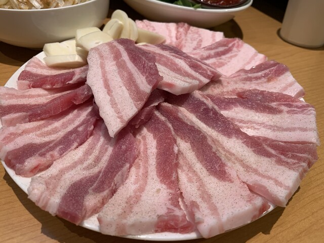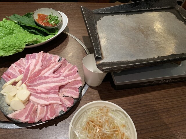 ・サンギョプサル(¥1500)(チシャ、ゴマの葉、ねぎサラダ付き)