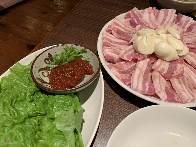 ・サンギョプサル(2人前)(¥3000):(チシャ、ゴマの葉、ねぎサラダ付き)