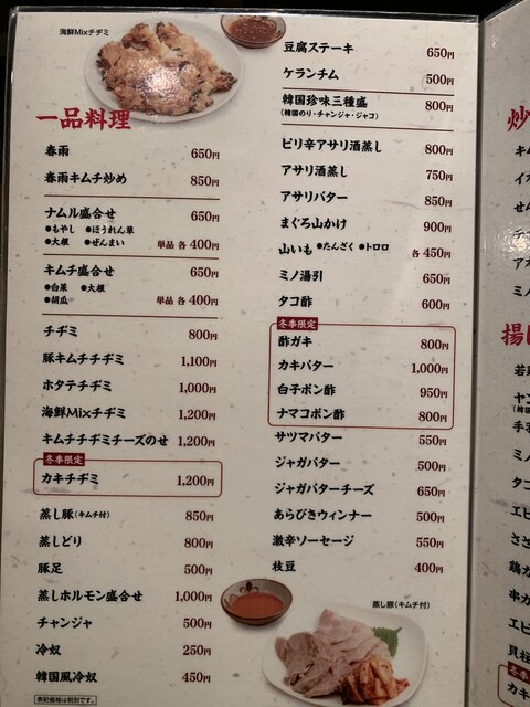 ・春雨キムチ炒め(¥850) ・ナムル盛り合わせ(¥650) ・キムチ盛り合わせ(¥650)