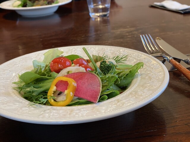 サラダというよりも生野菜のバルサミコ酢あえ。シャキシャキの野菜をシンプルにいただく、なぜこんなにうまいんだ