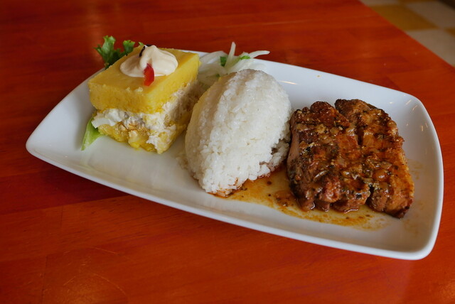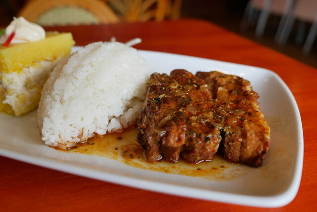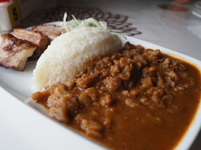 ADOBOはスペイン語で「漬ける」を意味し、ここでは豚肉をマリネ液に漬けて煮たものが提供されています。