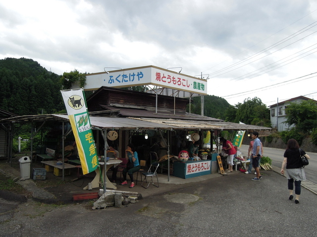 焼きとうもろこしや新鮮な野菜などの地元農作物や舞茸といった特産品を売る店が約30軒並びます。