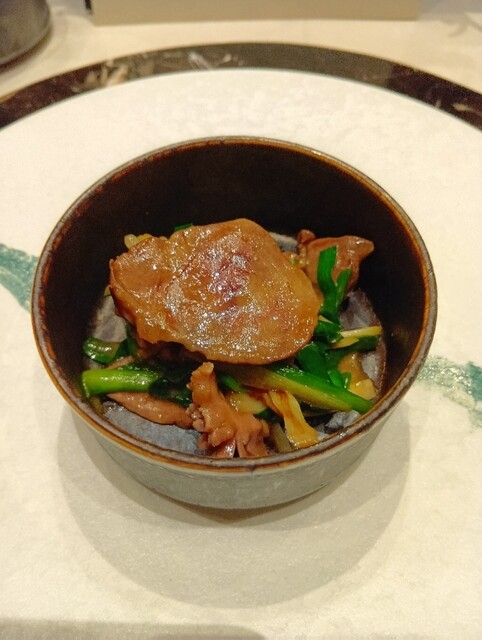 肝とずりの食感と味わい、シャキシャキ韮たち、株なめこの風味と新生姜の香りが楽しめます。