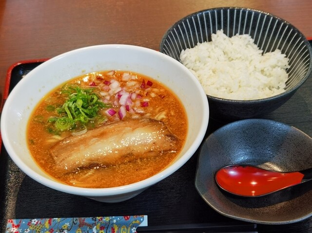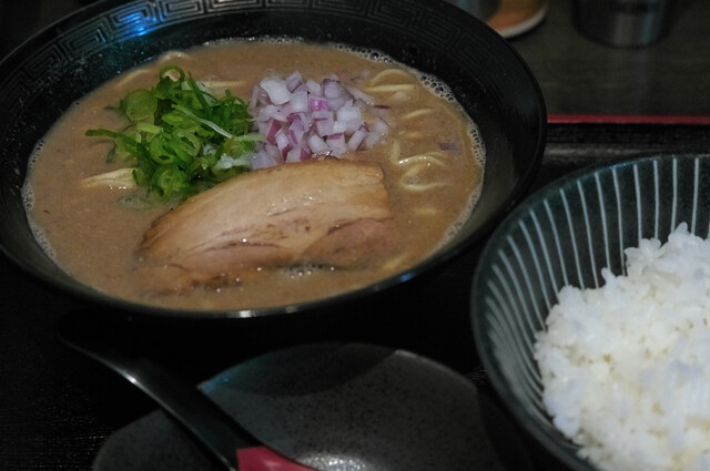 醤油の味が濃厚。ほんの少しだけ塩が強めだが、ほんのり脂が浮いてて美味しいスープだ。最後は飲み干した。麺は太めストレートで、噛み応えがある。チャーシューは鶏肉だが、脂身がなくあっさりしてて、レアーの感じ。ご飯は上手に炊けてて、麺とスープによく合う。