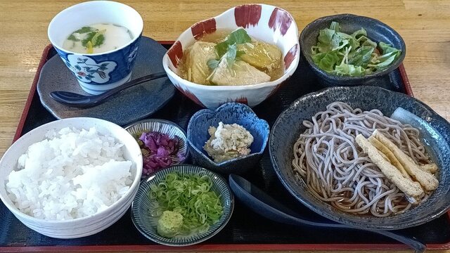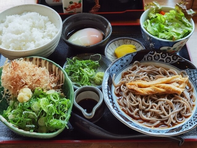 豆腐の肉質は相変わらず、キメが細かいのにしっかりしてる。よほど濃い豆乳を使わなければこうはならないだろう。また、薬味のネギと鰹節がいつにも増しててんこ盛り♡!専用のタレでいただくと、大豆の濃い味がよくわかってご飯がすすむ。サラダがついてくるが、きんぴらとおからの小鉢に変えてほしい。和食にサラダは合わない。漬物と豆腐である程度ご飯が減ったとこに、温泉卵を投入。温泉卵丼で蕎麦を食べるという炭水化物競争になった。そばの出汁を啜って、完食。