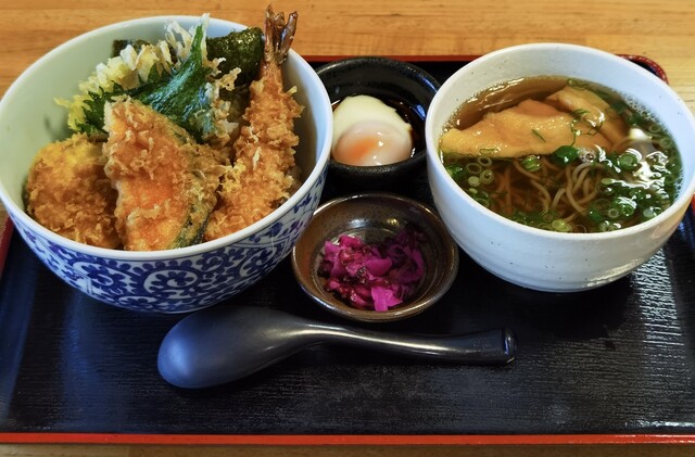 天丼と蕎麦のセットだ。温泉卵と柴漬けがついてくる。そばは伸びてない。ちゃんと噛み応えがある。よかった♡揚げとネギしかのってないシンプルな蕎麦だが、甘めの出汁とコシのある蕎麦が美味しい。出汁は天丼を食べる時、味噌汁代わりにもなる。天ぷらは天つゆで少しシナっとなってるのが残念。具は、海老・南瓜・薩摩芋・紫蘇・海苔。薩摩芋は茄子にしてほしかった。合間に温泉卵でご飯をいただいた。旨い♡