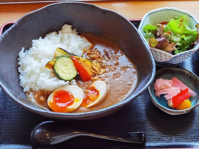 半熟卵 or 卵黄(お選びください)、素揚げ野菜、サラダ、ピクルス