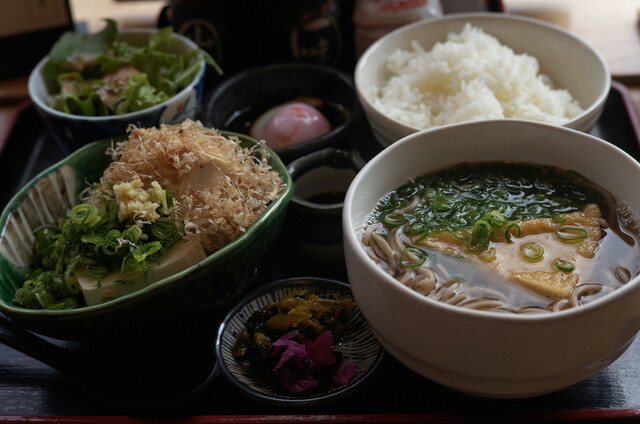 高いが、豆腐がスーパーに売られてるようなものとは一線を画しており、一度は食べてみる価値がある。しかし、昔の「丹羽の黒豆を使った色が白くない豆腐」の方が好みだ。復刻してほしい。豆腐は通常のものと比べると、濃くて堅い。これに、ネギと鰹節がこれでもかというくらいてんこ盛りで、生姜おろしだけは真ん中に上品に置いてある。これに、出汁醤油をかけて頂く。まず白いご飯に温泉卵をのせて、ご飯を一口いただく。残りのご飯で豆腐を頂く。薬味をのせただけの豆腐なのだが、普通の豆腐じゃないので、ご飯のいいおかずになっている。美味しい♡蕎麦は揚げとネギがのってるだけの質素なものだが、寒いので温かい蕎麦は美味しい。出汁も鰹出汁がよく出てて甘さ辛さは丁度よく美味しい。最後は飲み干した。味噌汁がわりだ。1つだけ、和食なのにサラダが残念。ほうれん草のお浸しにでもしてほしい。