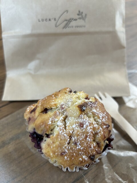 カフェラテはちょっと濃いめだけど、氷がいい感じに溶けてきた頃にちょうどいい苦味になって、甘いマフィンとよく合う!おやつタイムにぴったりの組み合わせでした。