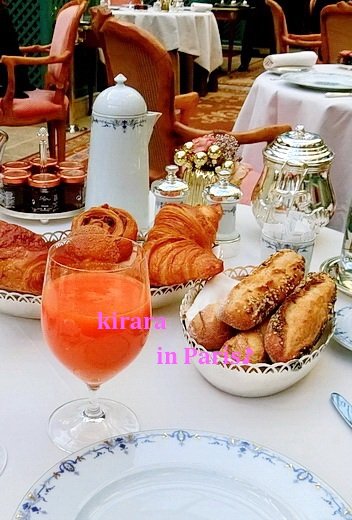 間があいてしまいましたが、前回に続き、皆さんをリッツパリにお連れし、日曜にいただいたランチ、サンデーブランチをお届けします(#^.^#)インテリアは素晴らしく、エントランスから続く回廊は美しくて優美・・・ 4年の歳月をかけて2016年6月にリニューアルオープンしましたから、以前のヨーロピアンでエレガントな雰囲気はそのままですが、やはり新しいので美しさが違いますね。その回廊の突き当りには、2ツ星に輝くフレンチレストラン、レスパドン(L'Espadon)が♪レストラン内は煌びやかで、うっとりする美しさ~~今回、ランチを楽しんできましたので、紹介させていただきますが、残念ながら、現在、こちらではランチはいただけなくて・・・ランチタイムは、隣接しているテラス風の空間で、柔らかな陽光に包まれていただきます。テラス風といっても、こちらも優雅な雰囲気です☆さすがリッツですよね〜 テーブルセッティングは上品でエレガント♪かすかな記憶ですが、数年前にレスパドンでお食事した時と、同じプレートのように思います。ファーストディッシュとして、ペストリーがサーブ・・・ ニンマリしちゃうくらい美味しそうなパン。ホスピタリティーの素晴らしさは言うまでもありませんが、日本語が流暢なフランス人スタッフさん、自称「宮本武蔵」さんが面白くて、面白くて!!お料理をもってきてくださった、スタッフさんに「佐々木小次郎、頑張っているか?」なんて言ったりして・・・その方が勧めてくださった、ジンジャー風味のキャロットジュースは、身体も喜ぶ、ヘルシーで美味なジュース。ペストリーはサクサクで、風味よく、超美味 (*^^)vさすがに全部食べることはできませんでしたから、お部屋にお持ち帰りしたかったくらい。kiraraに渡されたメニューにはお値段は記載されていませんでしたが、サンデーブランチは125€のコースのみで、前菜とメインを選ぶことができます。前菜は、お野菜が食べたかったので、フォアグラとアーティーチョーク入りのカントリーサラダ。メインのポーチドエッグには、ロブスターとホウレン草がたっぷり添えられています。そこに、ビスキュースープをかけてくださいます。ビスキューの風味が広がり、ポーチドエッグのトロトロ感が嬉しい、贅沢な卵料理♪友人はクリーミーポテトのボイルドエッグをオーダー。そしてデザートは、6種類・・・ どのデザートにしようかと思っていたのですが、全種類テーブルに運ばれてビックり!!チョコレートタルトにマーブルケーキ、ベリーのトーストブリオッシュにフレッシュフルーツ、マンゴークリームのムース、レアチーズのフローティングアイランド。カプチーノをいただきながら、スイーツ三昧のシアワセなヒトトキヽ(^。^)ノブランチが125ユーロだなんて、驚いてしまいますが、優雅な雰囲気に包まれて、お腹も心も満たされる、極上のヒトトキでした☆ ブログもご覧くださいね (^_-)-☆ →http://blog.livedoor.jp/kirara0809/archives/52427526.html