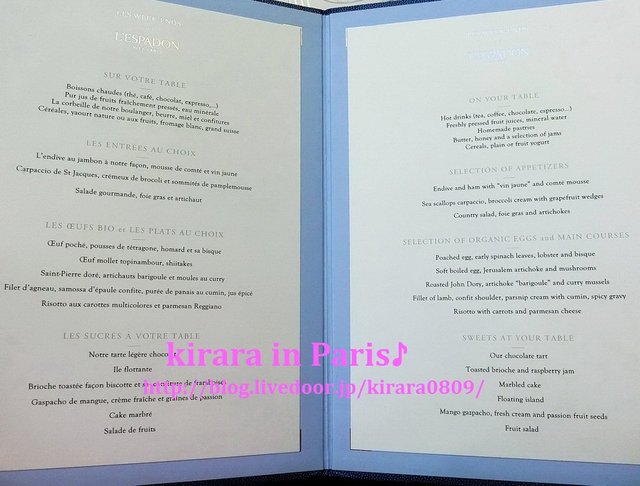 kiraraに渡されたメニューにはお値段は記載されていませんでしたが、サンデーブランチは125€のコースのみで、前菜とメインを選ぶことができます。