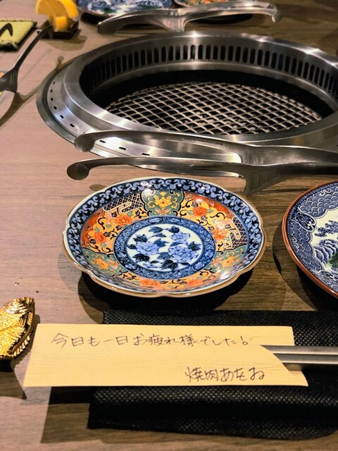 1日1組、ゆったりソファー席のみの焼肉屋さんで、純金の鯛の箸置き、江戸切子のグラスなど一流品ばかり、それに豪華な絵皿がイッパイ並べられたスゴイお店です (^_^)v
