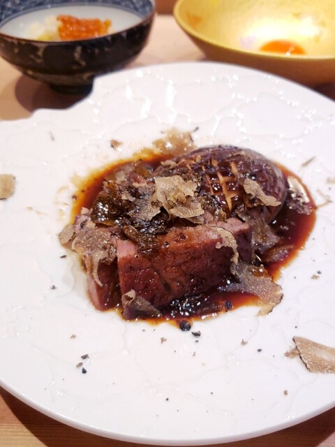 どのお料理も友人と感動しながらいただきましたが、終盤に登場した名物の「トリュフすき焼き」にはビックリ仰天 (@_@)