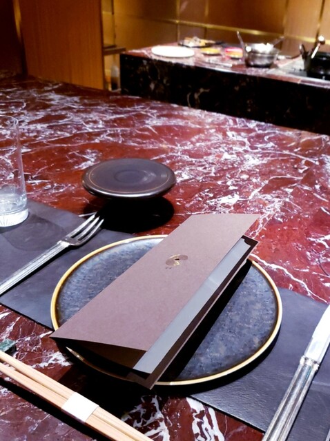 カウンターテーブルは、大理石の一枚板で重厚感溢れ、グラスはロブマイヤー、カトラリーはピュイフォルカ、お皿はオーナーさんが特注で作られたリモージュ焼き等・・