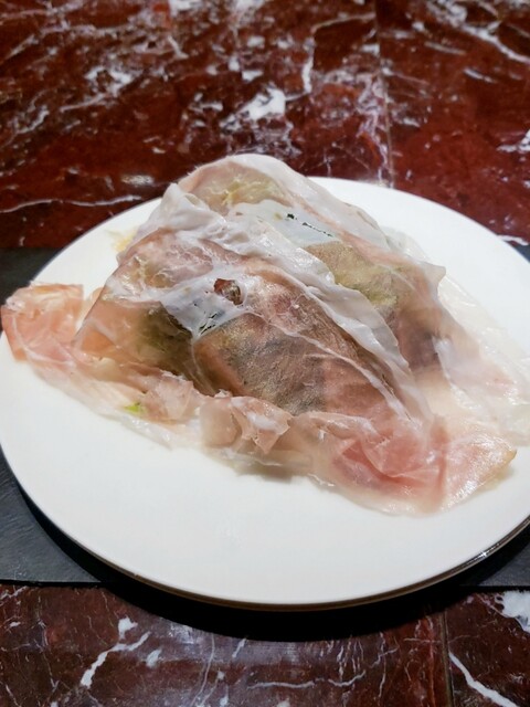 牛テールとホウレン草のソテーを包んだ熱々の春巻きをパルミジャーノチーズと共に