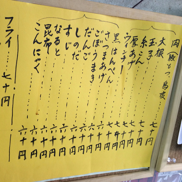 お鍋のスープはとても黒い色をしていますが、おでんの味はあっさりといくらでも食べられますよ、黒ハンペン、大根、豚モツは特にオススメです。