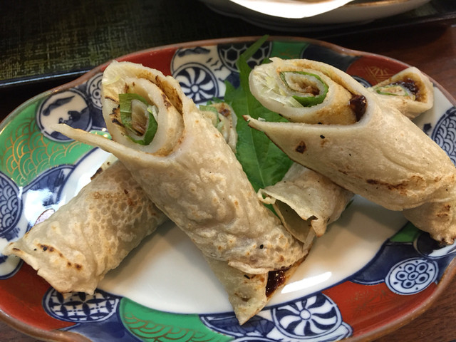 味噌とネギをそば粉のクレープ状に包んで焼いたものでモチモチの食感がかなりいけました。