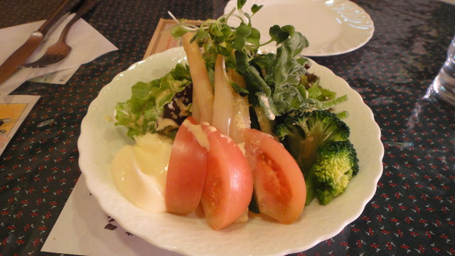 前菜のサラダにはこの店自慢の自家製ドレッシングがかかり、オレンジ色の野菜(人参かな?)などが細かく入っていてお酢の酸味もまろやかで美味しく癖になりそうな味。