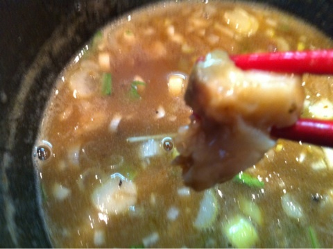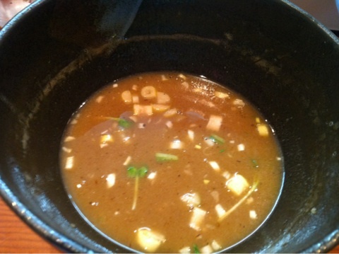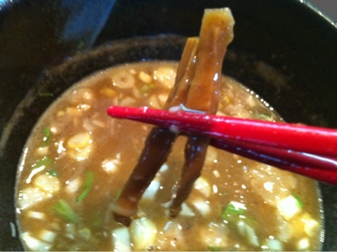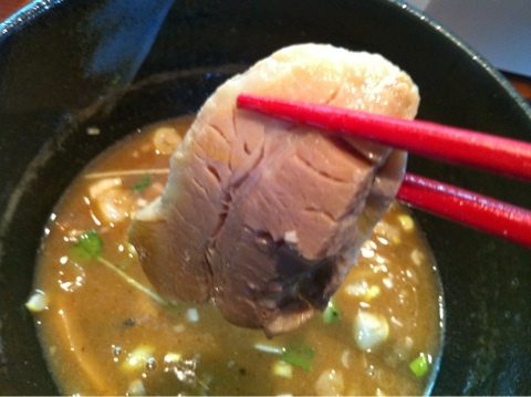 つけ汁の底にも、柔らかい角切りチャーシューがたっぷり。