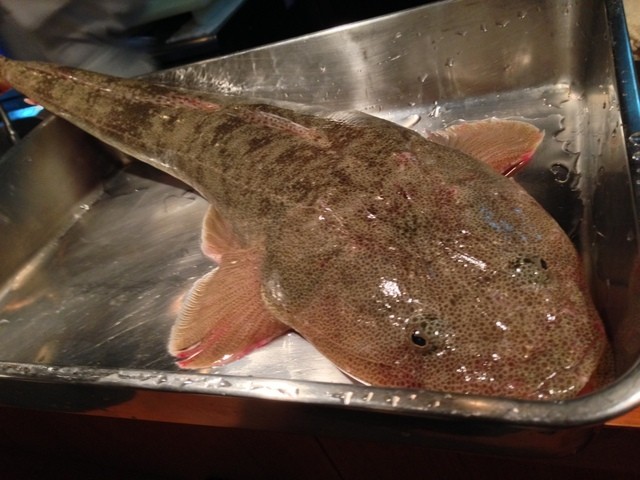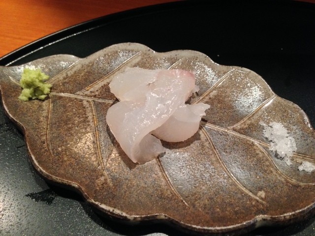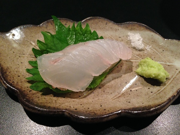 目の前で跳ねている、活きの良いマゴチを刺身にて、塩とズケで