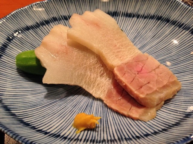 目の前でさばいていただいたカワハギを、美味しいキモと共にいただきます。