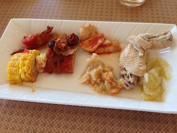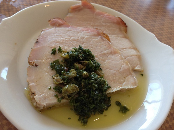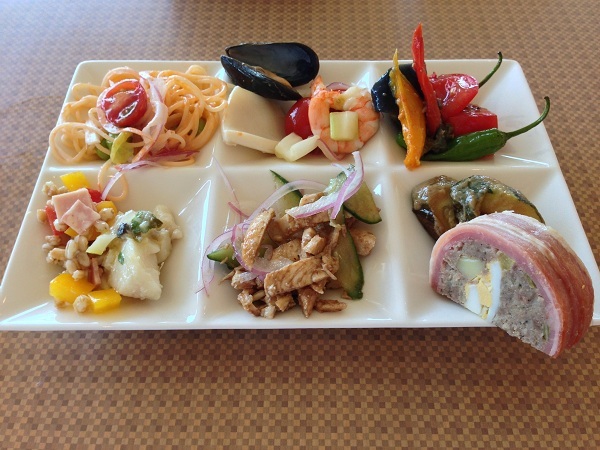 まずは前菜から。右下のかまぼこのような食べ物は、ジェノバ風チーマ。ボイルドエッグの挽き肉包みで、これがかなり好みな味付けです。