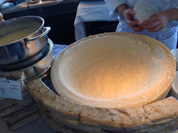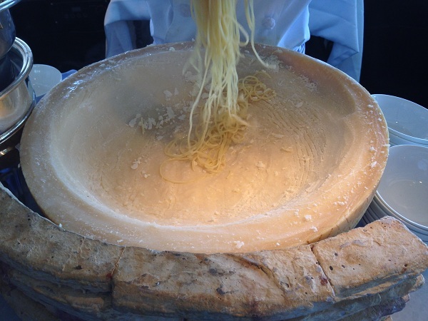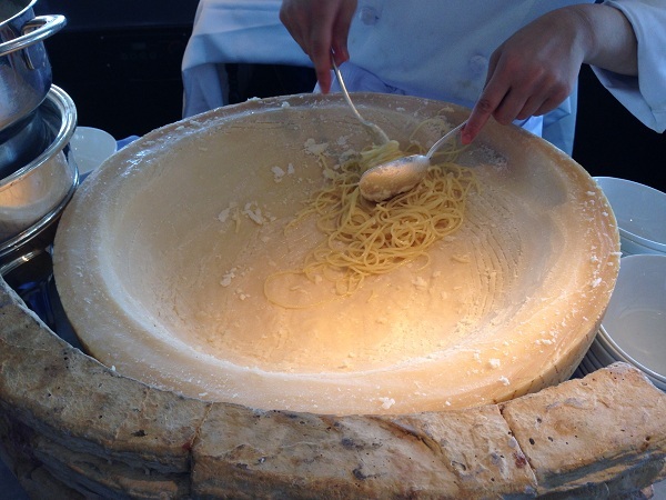 カルボナーラは、目の前で巨大なチーズを使って仕上げていきます。