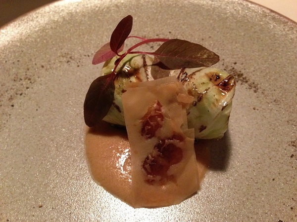 キャベツと蚕豆のロール仕立て ポルチーニ茸のムースリーヌソース