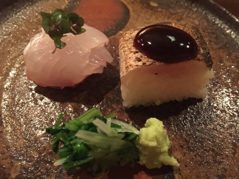 魚津産のヒラメとカマス寿司。平目には、刺身醤油とヘベズ醤油を漬け比べ。ヘベズはスダチやカボスに煮た柑橘で、さっぱりとした後味になります。