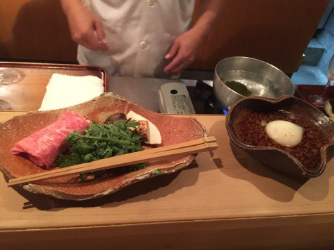 綺麗な飛騨牛と、長野県産の大きな松茸。大きな昆布が入った鍋で、目の前で作ってくれます。霜降りの柔らかい飛騨牛。松茸もしっかりした香りで、口の中に幸せが広がります。たっぷり入ったつゆは、別でしっかり煮込んで、うまさが増しています。割っていただく温泉玉子、たっぷり入ったそぼろもよく合います。もし良かったらということでレンゲを持ってきていただいたので、そぼろが食べやすかったです。