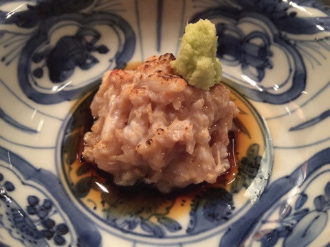 魚津産の毛蟹は軽く火を入れていて、焼いた蟹味噌と和えていて、ねっとり濃厚な味に日本酒がすすみます。こちらの毛蟹は7月から捕れるそうです。
