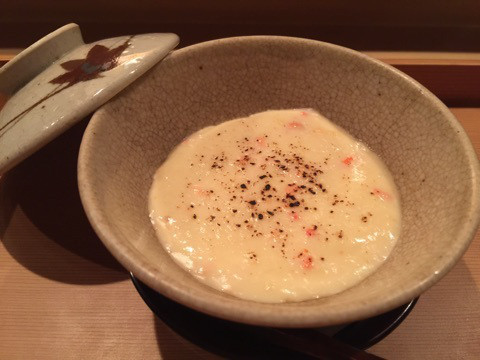 新湊のベニズワイガニがたっぷり入っていて、上はトロットロのグラタンのように焼いています。下は確かに茶碗蒸しで柔らかいです。