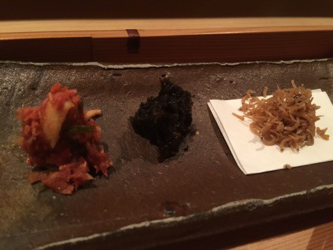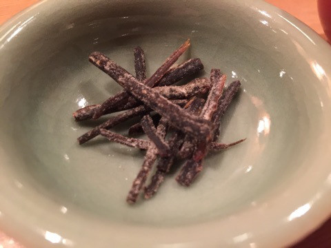 ゴボウの塩麹、きゅうりの浅漬けご飯をいっぱい食べているうちに、自家製の香の物を、さらに追加で4種類出していただきました。左から、梅じゃこ、とろり昆布、自家製ちりめん山椒。そして、粉雪。こちらはとても上品な、塩挽き昆布。自然な塩味に白エビの塩味を加えて、じっくり2ヶ月かけて作っているそうです。