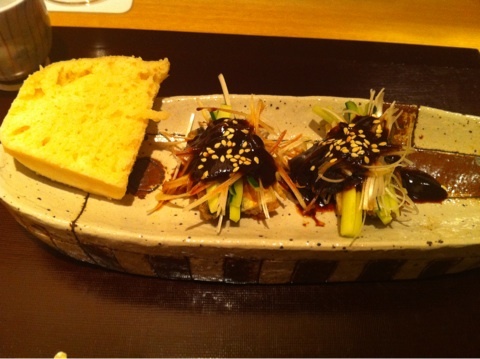 続いて、うなぎです。身はふっくらと仕上げた後、表面を強火でカリッと仕上げています。上には細切り野菜と、甘い味噌。蒸しパンと食べると、北京ダックのような味でビックリです。和食屋さんなのに、蒸しパンも自家製というこだわり。