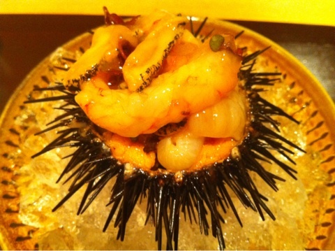 ぱっくりと割った生ウニの上に、海老、ツブ貝がのっています。