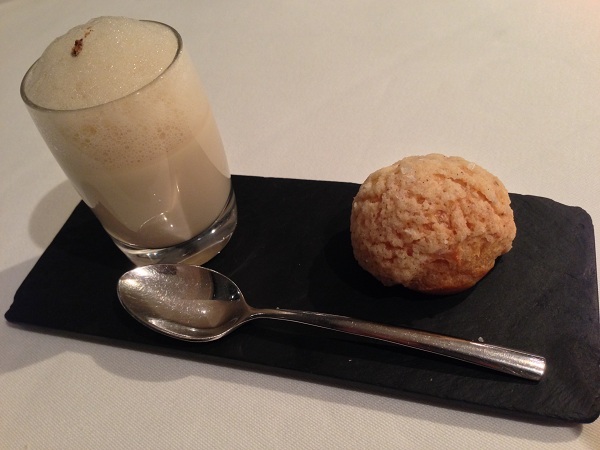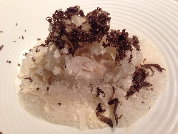白身と白子の上には、カリフラワーのスライスとメレンゲ。
