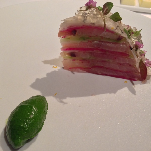 ブリと数種類の大根のミルフィーユには、わさび菜のソースを合わせていただきます。